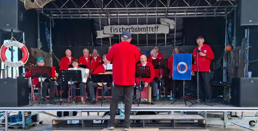 Mit seemännischen Melodien wie „Heute an Bord“ oder der Shanty-Ballade „Ein Hering und eine Makrele“, in der die schicksalhafte, romantische Beziehung zwischen einem Hering und einer Makrele erzählt wird, sorgte der Shanty-Chor Eutiner Wind beim 40. Fischerbudentreff in Dahme für zusätzliche maritime Atmosphäre. Die Aufforderung vom „Steuermann“ und Dirigenten der Eutiner Sänger, Peter Ernst, an das Publikum rhythmisch mit zuklatschen und dessen vielstimmiges Mitsingen bekannter Melodien machten den Auftritt des Shanty-Chores Eutiner Wind zu einem fröhlichen Gemeinschaftserlebnis. Es verwundert daher nicht, dass mancher Blick aus dem Publikum in die Weite des Horizonts hinter der vor dem Strand stehenden Bühne die Sehnsüchte in den Liedtexten mitzufühlen schien.
